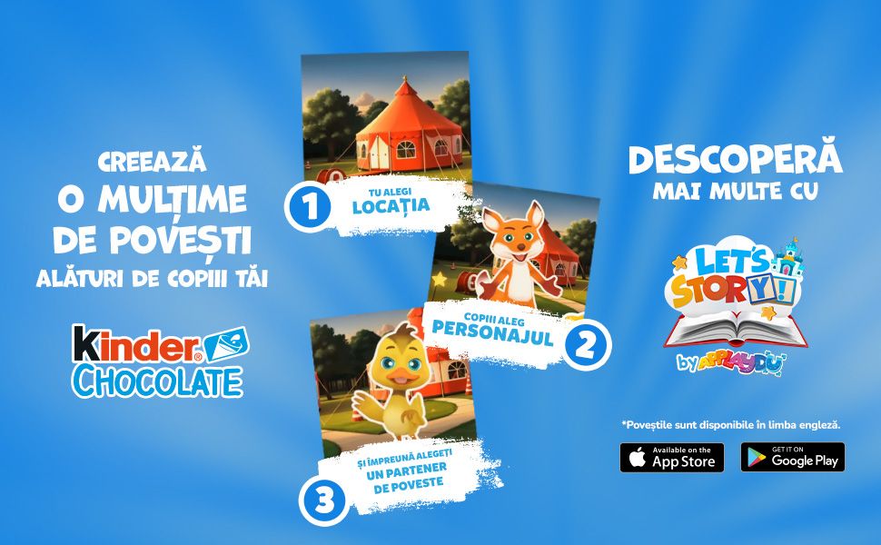 Kinder Chocolate știe cât de speciale sunt aceste momente și îți oferă o nouă modalitate interactivă care încurajează colaborarea în familie, prin care poți crea povestea perfectă pentru copilul tău, exact așa cum o dorești! Let’s Story, cea mai nouă insulă din Applaydu, aplicația care aduce împreună cititul, creativitatea și jocul. În Let’s Story, sunteți la cârma poveștii voastre.
