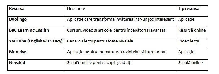 Tabel. Cele mai bune resurse pentru învățarea englezei.